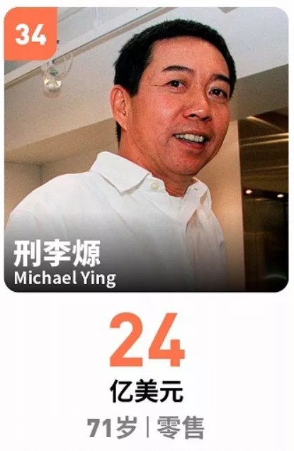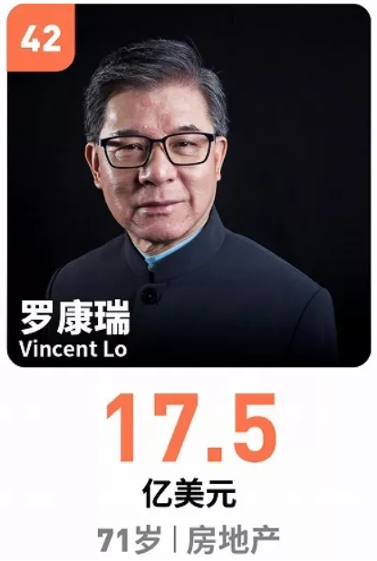 朱玲玲丈夫羅康瑞身家17.5億美元(約合113億元人民幣),排在42位。