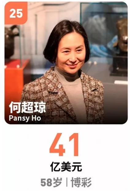 跟隨鄺肖卿之後的是賭王二房千金何超瓊,她以41億美元(約合264億元人民幣)身家排在富豪榜25位。