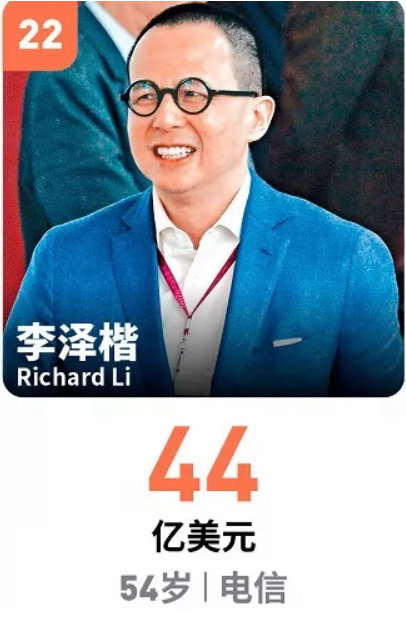 值得一提的是,李嘉誠的小兒子李澤楷,以44億美元(約合283億元人民幣)身家,排在22位。