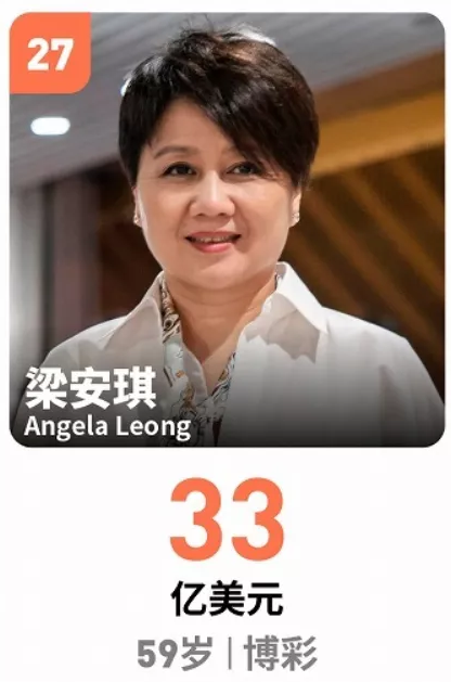 第三名女富豪是賭王四太太梁安琪,她排在富豪榜27位,身家比何超瓊少些,總值33億美元(約合212億元人民幣)。