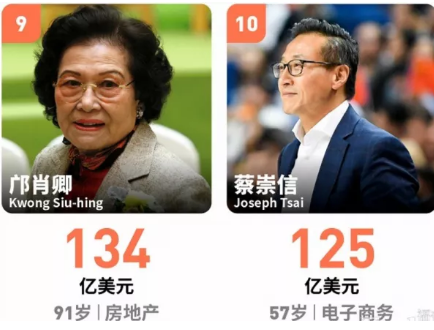 女富豪排名方面,依舊是新鴻基地產創辦人郭得勝的夫人鄺肖卿第一,91歲的她擁有134億美元(約合864億元人民幣)在富豪榜排第九,她性格強勢是有名的鐵娘子。