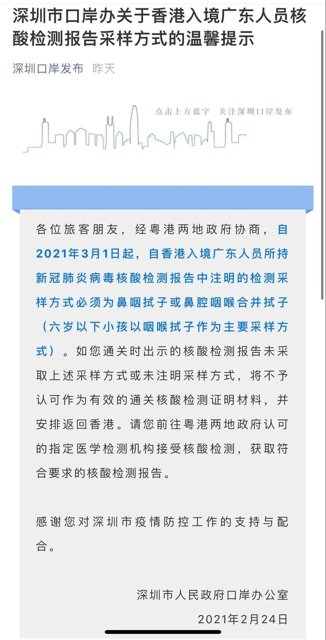 24日,“深圳口岸發佈”微信公眾號發佈了關於香港入境廣東人員核酸檢測報告採樣方式的溫馨提示。