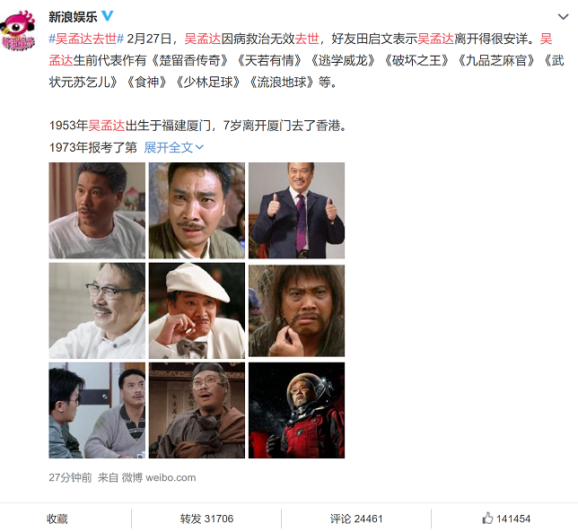 吳孟達逝世的消息傳出後,迅速登上微博熱搜榜的第一位,大量內地線民表示哀悼,亦有線民稱,「這是一條不敢點開的熱搜」。