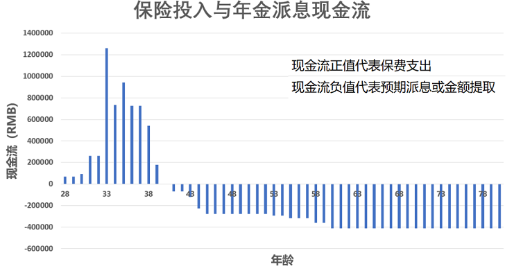 從圖表中可以看到,從33歲到38歲這幾年間,是我保費支出最大的,不過在40歲之後,我預期就不需要再有保費的支出,沒有供完的重疾險已經可以由儲蓄險派息提取去覆蓋了。而預期到了45歲開始,每年就有大約20萬-30萬人民幣的保險現金流入。到了退休年齡時,又有一份養老金保險可以開始提取,所以每年預期可以提取約40萬人民幣。