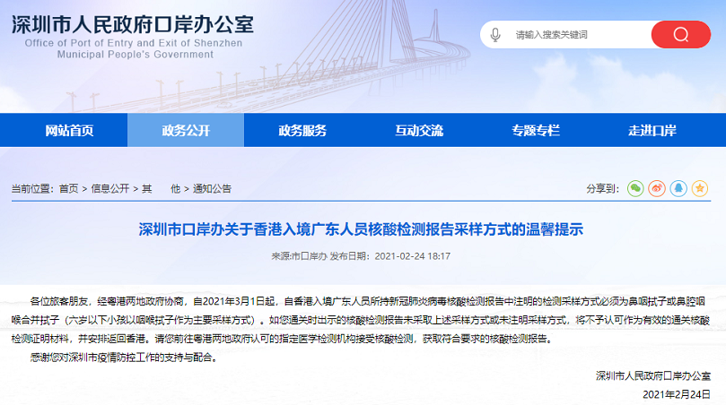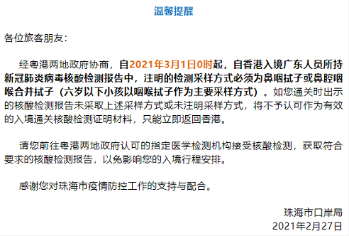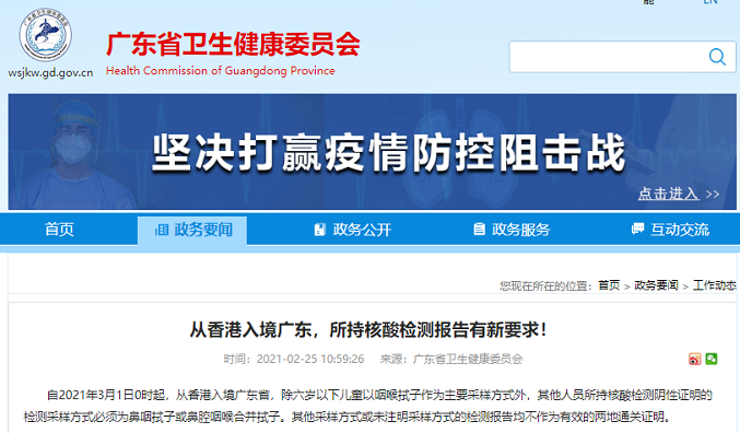 據廣東省衛健委公告:自2021年3月1日0時起,從香港入境廣東省,除六歲以下兒童以咽喉拭子作為主要採樣方式外,其他人員所持核酸檢測陰性證明的檢測採樣方式必須為鼻咽拭子或鼻腔咽喉合併拭子。其他採樣方式或未注明採樣方式的檢測報告均不作為有效的兩地通關證明。