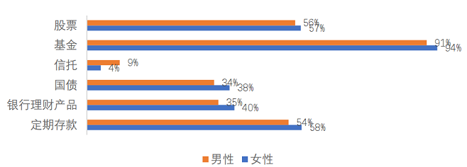 傳統觀點認為,男性更加理性,更加敢於冒險,能夠承受一定的風險;女性普遍更加感性,對於數字不敏感,大多只以現金方式進行穩健投資。然而,在《報告》樣本中,94%的女性購買了基金產品,57%的女性購買了股票產品,與男性相比並無明顯差別。