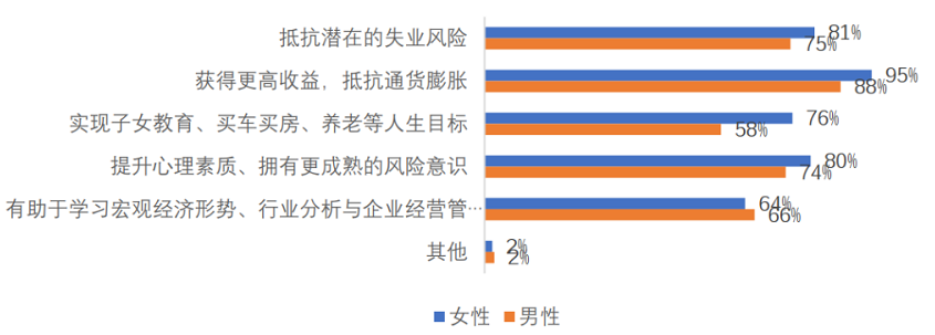 女性理財的目的以提升生活品質,實現資產的保值增值為主。《報告》發現,約95%的女性和88%的男性受訪者都認為理財能夠抵抗通貨膨脹。同時,女性相對更依賴理財實現自己的人生目標:高達76%的受訪女性希望通過理財實現子女教育、買房買車、養老等人生目標,而這一比例在男性中只占58%。