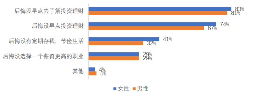在被問及最後悔過去沒能做到以下哪些事情來提高自己的金融保障水準時,83%的女性表示,是沒有早點去瞭解投資理財的知識,74%的女性後悔沒有早點開始進行投資理財。