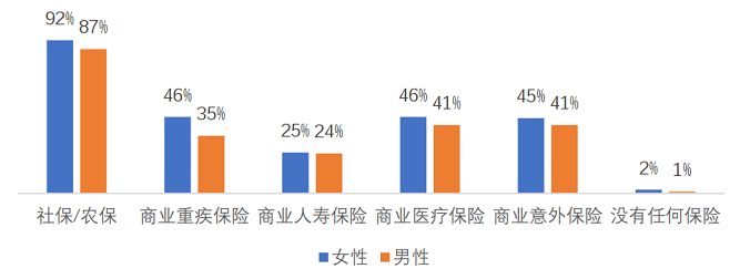 調研數據顯示,受訪女性社保覆蓋率高,達到92%,但商業保險保障水準相對較低,僅有46%的受訪女性配備了重疾險,25%的受訪女性購買了商業人壽保險。