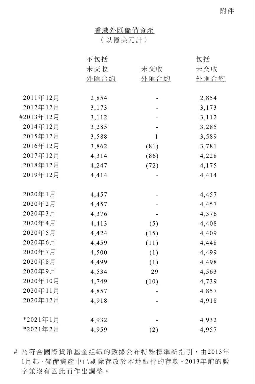 金融管理局3月5日公佈,2月底香港官方外匯儲備資產為4959億美元,較1月底增27億美元,這已經是連續第六個月上升。
