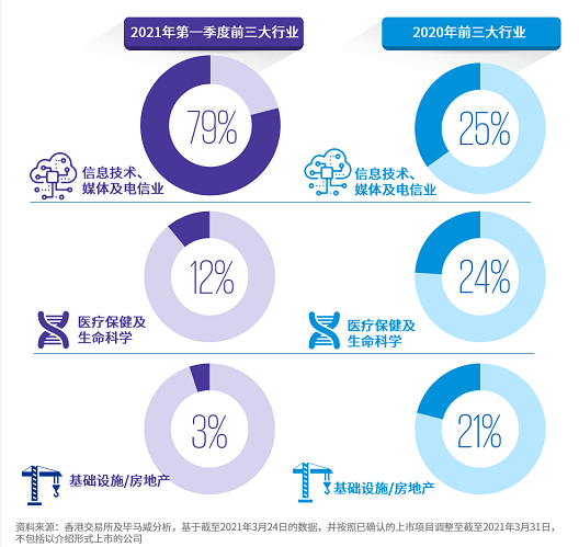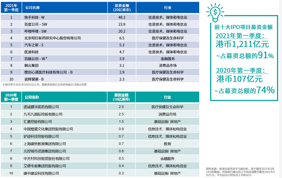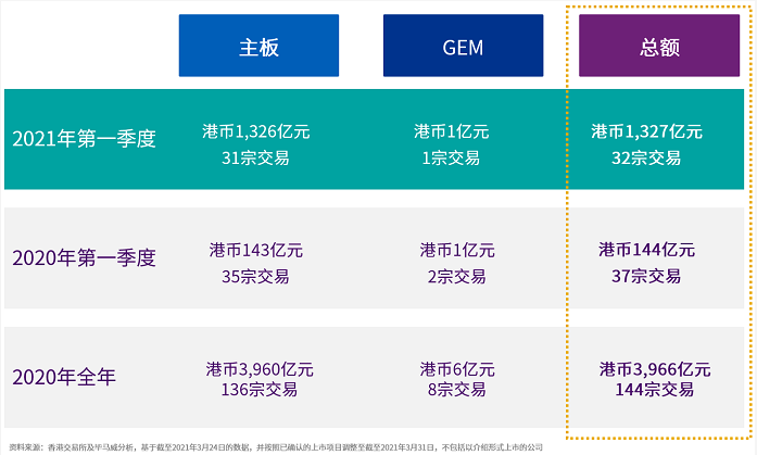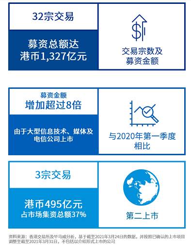 經過2020豐收年後,2021年第一季度市場氣氛持續熱烈。受市場流動性充足及新冠肺炎疫情後經濟復蘇的推動,本季度投資者需求保持穩健。首季度,三家大型(1)的內地科技公司在香港上市,使交易所的募資總額創同期歷史新高。該三宗最大的IPO共募集港幣924億元,占本季募資總額的70%。