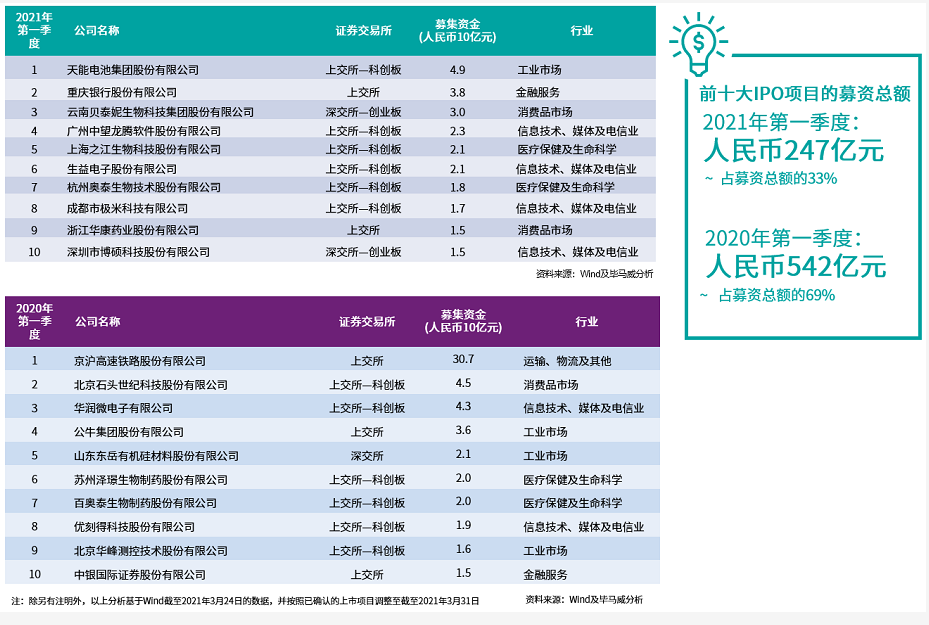 科創板市場在2021年第一季度錄得35宗IPO,募資總額達到人民幣332億元,進一步彰顯其重要性。以募集資金計,在前十大A股IPO中,有六宗來自科創板市場。
