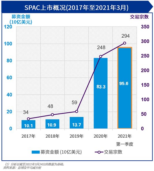 承接去年熱烈的市場氣氛,SPAC上市於本年度續創高峰,2021年第一季度SPAC上市募集資金額高達956億美元,超過去年全年的833億美元。與傳統上市不同,SPAC (又稱為“空白支票公司”)是沒有運營業務的上市實體,其籌集資金的目的是在集資後物色並收購有營運業務的公司。