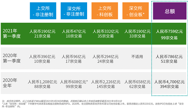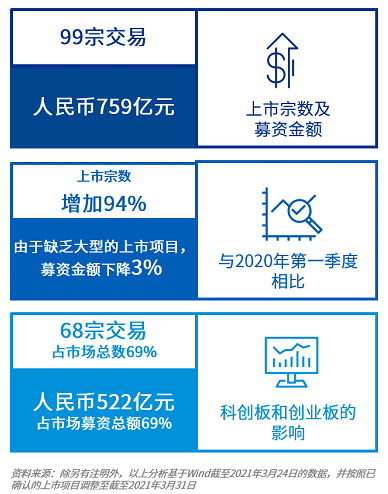 受惠於深圳創業板上市宗數的增長,2021年第一季度的IPO宗數較去年同期翻倍。但由於期內沒有大型上市项目(京滬高鐵於去年同期上市,募資金額人民幣307億),本季度募資總額較去年同期下降了 3%。