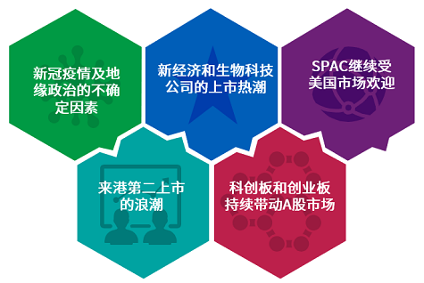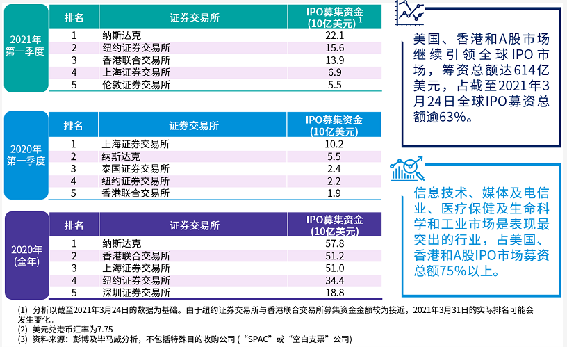 進入2021年,IPO市場氣氛依然熱烈。儘管新冠肺炎疫情持續及其他社會和經濟問題導致市場出現不確定因素,但市場資金流動性高,投資意欲依然高漲。受益於美國和香港市場(尤其是新經濟公司上市)募集資金增加,2021年第一季度全球IPO募資金額為去年同期逾三倍。
