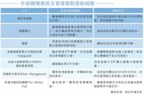 金融機構進出在世界各地是平常事,例如去年便有外資券商撤出台灣。去年8 月,在台灣設立近19 年的德意志證券(亞洲)台北分公司終止營業,原因是集團將專注於銀行業務,並全面裁撤全球證券交易業務。另外,滙豐銀行盛傳考慮撤出美國零售銀行業務,原因是配合集團「重返亞洲」策略,將資源轉移至亞洲地區,以加大亞洲區業務。香港方面,近期有3家大型國際金融機構打算將部分業務撤出香港,包括全球第二大資產管理公司領航基金(Vanguard)、加拿大BMO環球資產管理,以及美國對沖基金Elliott Management。其後又有謠言稱日本網上券商SBIHoldings(思佰益)要撤出香港,但管理層很快澄清,有關的傳聞與事實相反。