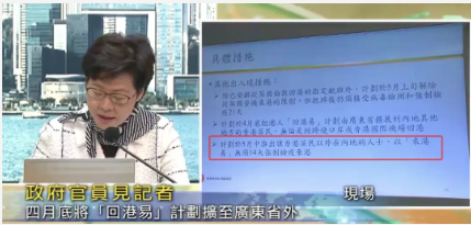 林鄭月娥表示,預計4月底,把回港易將擴至廣東省以外內地省市回港的香港居民,無論是經跨境口岸還是香港國際機場回港,回港時都不需要14天檢疫。