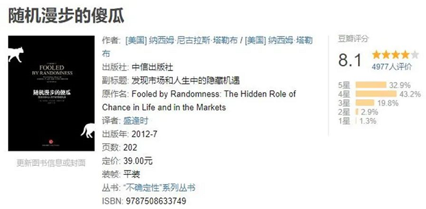 當隨機性的黑天鵝出現時,你可能一夜暴富,也可能在一次失誤中回到原點。但我們天生傾向於忽視低概率事件的可能性,無論這些事件會引發多大的災難。《隨機漫步的傻瓜》以深刻獨到的視角,告訴你這個隨機世界的規律和運行方式。隨機性雖然無法避免,但我們可以學著接受它。就像在投資市場上,如果一個小概率事件可以帶來巨額回報,為什麼不在這個事件上持續下注呢?換一種思維方式,做“隨機漫步的傻瓜”,我們對人生的瞭解無疑將大為增進。