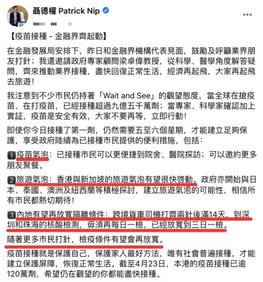 公務員事務局局長聶德權昨日稱,隨著更多市民打疫苗,內地有望再放寬已接種港人的隔離條件,但要視乎本港疫情。聶德權指出,政府將陸續為已接種市民提供便利措施,包括「疫苗氣泡」及「旅遊氣泡」,即已接種市民可以更便捷到院舍及醫院探訪,可以邀約更多朋友聚餐,而旅遊氣泡則是未來與新加坡,以至其他國家地區的出遊旅行的渠道。