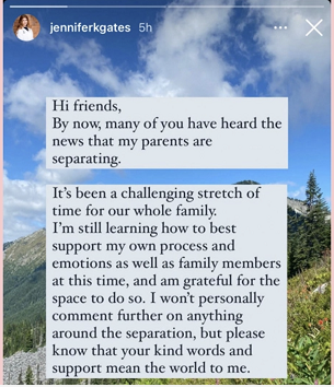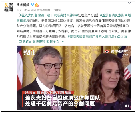比爾·蓋茨夫婦最近的一次同框出現是在當地時間4月19日,為支持醫護工作者而錄製了視頻講話。僅僅才過去兩個星期的時間,夫婦二人就宣佈離婚了。兩人宣佈離婚的消息震驚全球,他們的女兒珍妮弗蓋茲(Jennifer Gates)在 Instagram 上寫道: