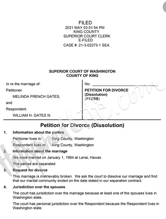 時代華納旗下一家名人八卦新聞網站“TMZ”5月3日稱獲得了蓋茨的離婚文件。這份文件顯示,梅琳達起草了這份申請,理由是婚姻破裂無法挽回。文件要求法官裁定“在分居協議所述日期”終止婚姻關係。這份分居協議並未包含在離婚申請中,但顯然二人早些時候已經分居並簽署了這樣一份文件。