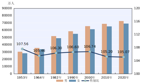 男性人口為72334萬人,占51.24%;女性人口為68844萬人,占48.76%。總人口性別比(以女性為100,男性對女性的比例)為105.07,與2010年基本持平,略有降低。出生人口性別比為111.3,較2010年下降6.8。我國人口的性別結構持續改善。