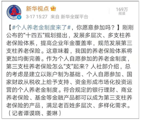 其實,在幾個月前的兩會上,“發展第三支柱養老保險”已經明確納入到政府報告裏了,這是頭一次。以國家之名,強化第三支柱的養老保險發展,對於老百姓來講,則是一個明顯的信號。