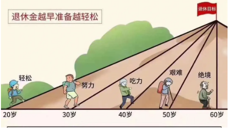 養老如同爬山,越早開始,後面的路越容易。如果我們選擇在20歲爬60歲的山,這個坡度我們走路就可以過去,我們需要的只是時間而已;如果到55歲,甚至到60歲的時候再考慮爬60歲的山,這時我們需要扶梯才能上山,甚至還需要專業的登山工具;等到60歲以後,就是想爬也爬不動了。爬山就是一個過程,而選擇什麼時候來爬?在什麼地方爬?就會有呈現出不同的效果。
