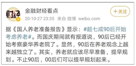 去年國慶期間,第一批90後已經去考察養老院了的話題也曾引起了熱議,根據《國人養老準備報告》顯示:超七成90後開始考慮養老。