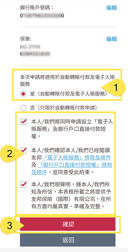 如果想同時申請電子入賬,則勾選「是」;僅申請自動轉賬則勾選「否」(建議勾選“是”,便於以後理賠或提取款項直接入賬)。