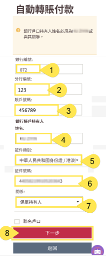 香港大部分銀行的分行編號都是銀行帳戶號碼的前三位,假如你的銀行帳號是123456789;分行編號則輸入123,帳戶號碼則輸入456789。