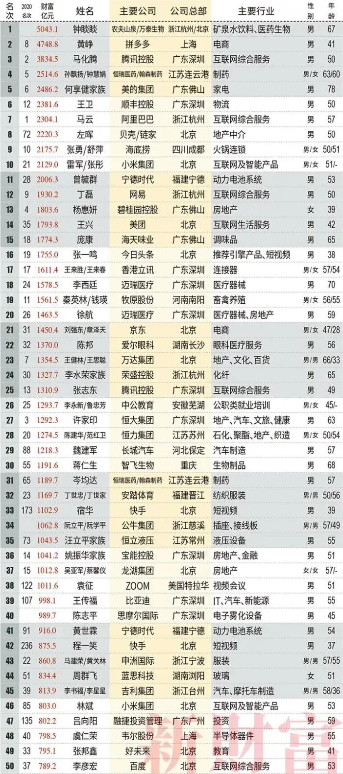 1)鐘睒睒以超5000億元的財富取代馬雲高居榜首,壓過一眾互聯網巨頭;