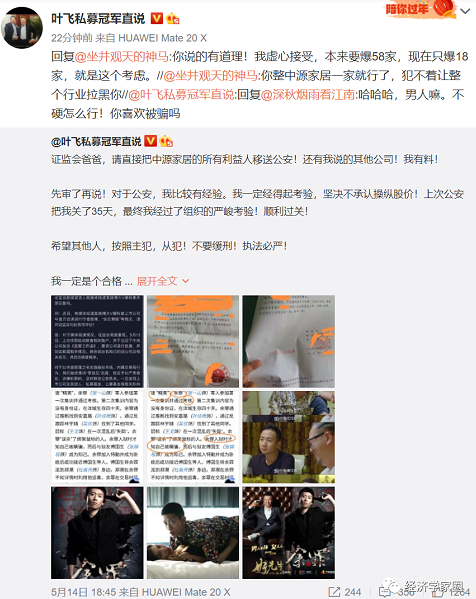 從5月9日爆料的中源家居“黑吃黑”事件起至今,葉飛的爆料仍在持續。昨晚,葉飛又進行了一個半小時的直播,不僅牽扯出了更多上市公司,還在粉絲群曝光了相關語音,連續發了上百條微博。