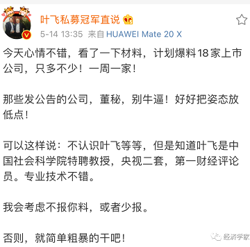 5月14日,葉飛表示,他計畫陸續爆出18家上市公司此類違規操作,只多不少。