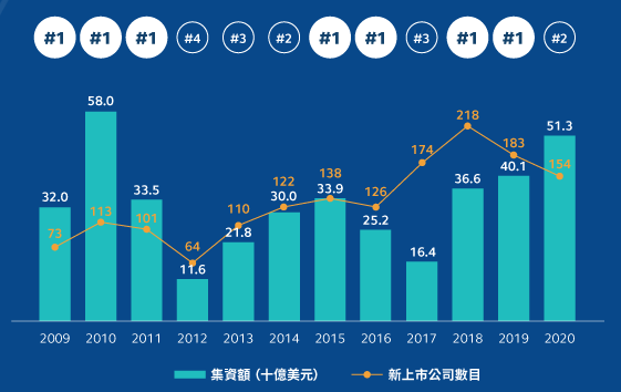 一直以來,香港首次公開招股市場活躍,過去12年中有7年排名全球第一,2020年集資額達4,001億港元,排名全球第二,創歷史新高。