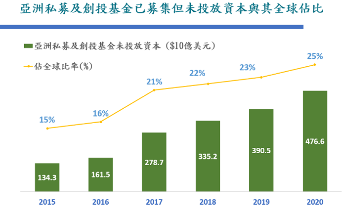 近期行業研究報告統計顯示,亞洲私募及創投基金已募集但未投放的資本(行業內稱為Dry Powder)創下4,700億美元新高,占全球25%。以資產管理規模計算,香港目前已經是亞洲區內第二大私募基金市場(管理1,730億美元),僅次於內地。