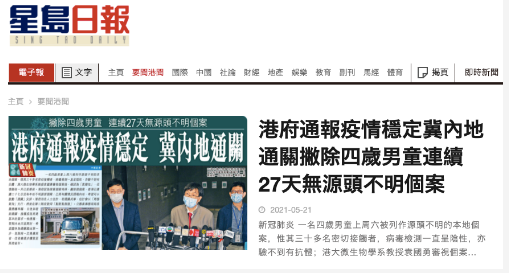 香港今日(21日)沒有源頭不明新型冠狀病毒個案,連續5日本地零確診,連續27天沒有本土確診不明感染源個案,香港特別行政區政府20日已將有關情況通報內地,希望可以啟動「通關」安排。港府消息人士預計,若通關成功,預估會以「商務氣泡」先行,然後在第二階段啟用「點對點旅遊」。