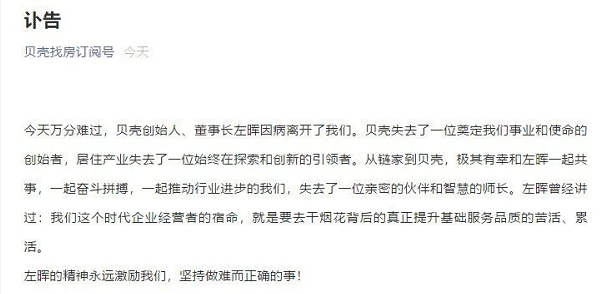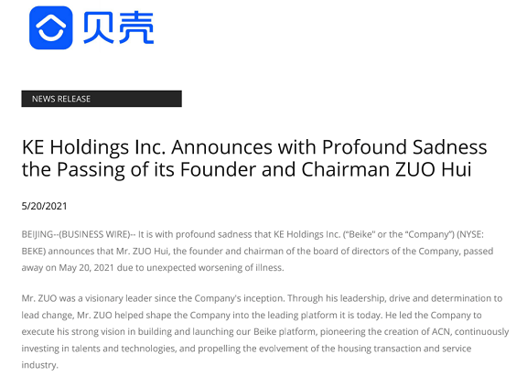 5月20日,貝殼發佈公告,公司創始人兼董事長左暉先生因疾病意外惡化於2021年5月20日去世。公司董事會將對公司治理和相關事宜作出適當安排,並在兩周內適時公佈。