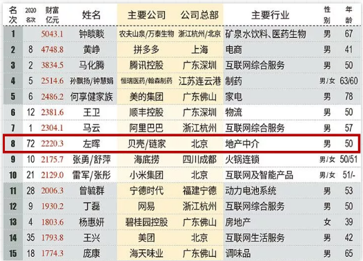 左暉由房產仲介起家,鏈家、貝殼、自如皆出自他手,上一年,他的財富值僅有300多億元,而貝殼成功IPO,帶動其身家暴增。