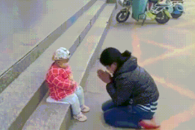 孩子無辜地看著母親的舉動,完全不明白媽媽的意思,還拍了拍媽媽的頭,起身想讓媽媽坐下。