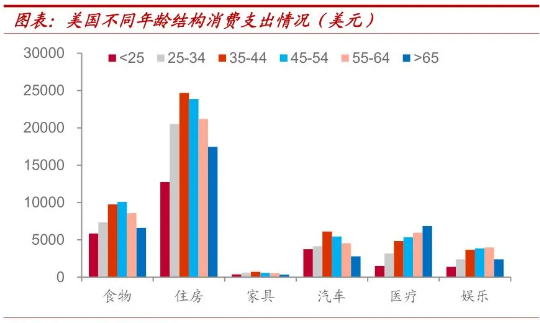 另一方面,從結構上來看,不同年齡段人群的消費偏好也不盡相同。以美國的情況為例,老齡人口在醫療服務上的支出較多,而勞動年齡人口更偏好耐用品消費,因而我國人口年齡結構的變化意味著商品消費需求將逐漸讓位於服務消費。
