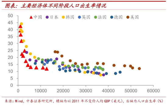 出生率同期墊底。同主要發達經濟體相似發展階段相比較,當前我國人口出生率更低,這也是拖累我國人口增速的主要原因。如日本和韓國在和我國人均GDP相當的時期,人口出生率水準要高出我國4-5個百分點,歐洲國家的情況也普遍如此,人口出生率的低迷或與我國此前嚴格執行的計劃生育政策有關。