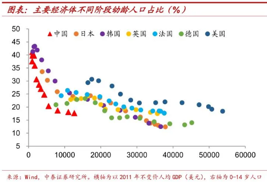 幼齡人口占比居末。由於出生率水準較低,因此,同主要發達經濟體相似發展階段相比較,我國幼齡人口占比同樣墊底。發達經濟體在同我國當前人均GDP相當的時期,幼齡人口占比多數並未跌破20%,不少國家甚至保持在25%以上。