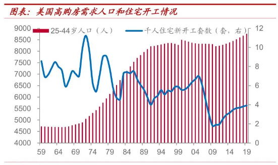 數量紅利消失,住房需求走弱。一方面,從總量上來看,人口數量紅利的消失意味著住房需求趨於走弱。以美國的發展經驗為鑒,美國高購房需求人口的數量變化決定著住宅開工的強弱。在1970-1990年代的快速上升期,美國每年千人新開工住宅套數穩定在8套左右,而其後逐步下臺階,目前每年千人新開工住宅套數僅有當時一半左右,日韓的情況同美國也基本類似。