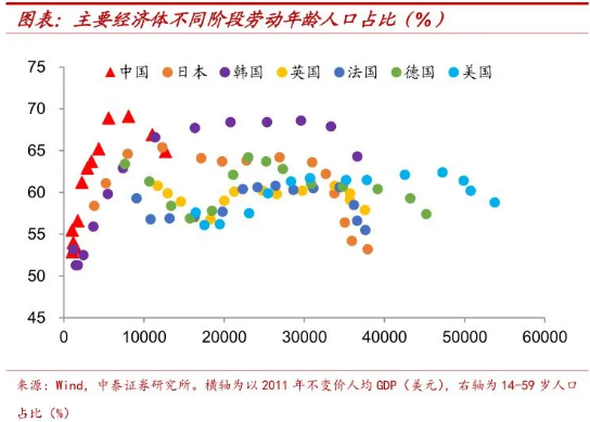 勞動年齡人口占比持平於日韓同期。同主要發達經濟體相似發展階段相比較,此前我國勞動年齡人口占比明顯偏高,這也曾支撐了我國經濟的快速增長。而在當前這一發展階段,我國勞動年齡人口占比已經逐漸趨於回落,目前與相似發展時期的日本和韓國相差不大,但要顯著高於歐美國家的水準。