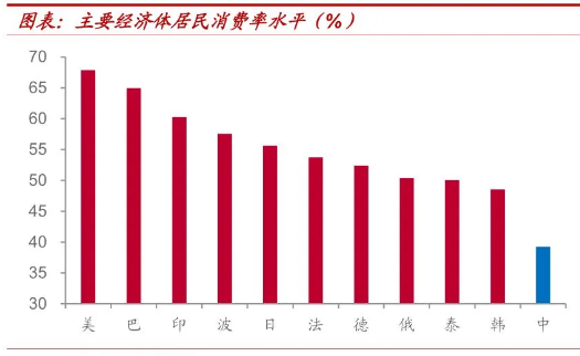 消費率明顯偏低。但我國消費率水準在主要經濟體中明顯偏低,特別是居民消費率不僅低於發達經濟體,甚至趕不上部分新興經濟體。2019年我國居民消費率尚不到40%,而像俄羅斯和泰國,居民消費率水準也要超過50%,美國更是接近70%。