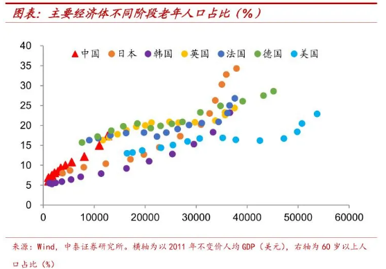 老齡化程度遠超同期日韓,但和歐美差別不大。同主要發達經濟體相似發展階段相比較,我國老齡人口占比高於東亞的日本和韓國,在與我國當前發展階段相似時期,日本60歲以上年齡人口占比僅在10%左右,韓國的老齡化程度更低。但我國老齡人口占比與同時期的歐美發達國家差別不大。