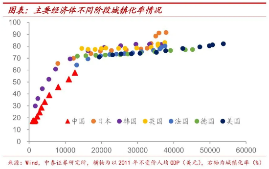 城鎮化率偏低,穩態或將提前。雖然我國人口城鎮化率上升勢頭較快,但同主要發達經濟體相似發展階段相比較,城鎮化率水準明顯偏低。在與我國目前人均GDP水準相當的時期,歐美和日韓等經濟體城鎮化率多數已接近或超過70%。根據發達國家發展經驗來看,在城鎮化率水準突破70%以後,城鎮化進程將會顯著放緩,而我國偏低的城鎮化率意味著可能提前達到穩態水準。
