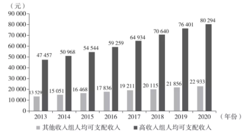 資產估值的分化,也間接帶來了居民收入的分化。國家統計局數據顯示,2020年高收入組人年均可支配收入增長5.1%,高於其他收入組0.2個百分點。從絕對數值上看,高收入組和其他收入組的人均可支配收入差距,從2013年的3.4萬元增加到2020 年的5.7萬元。