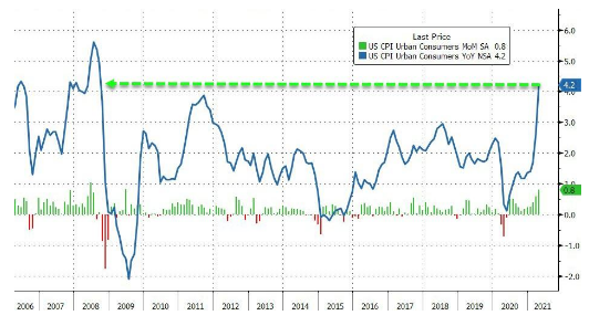 美國勞工統計局最新公佈的數據顯示,美國4月CPI同比上漲4.2%,創2008年9月以來新高。由於美國貨幣政策的變動將帶來美元資產價格的調整,美聯儲成為全市場的焦點。